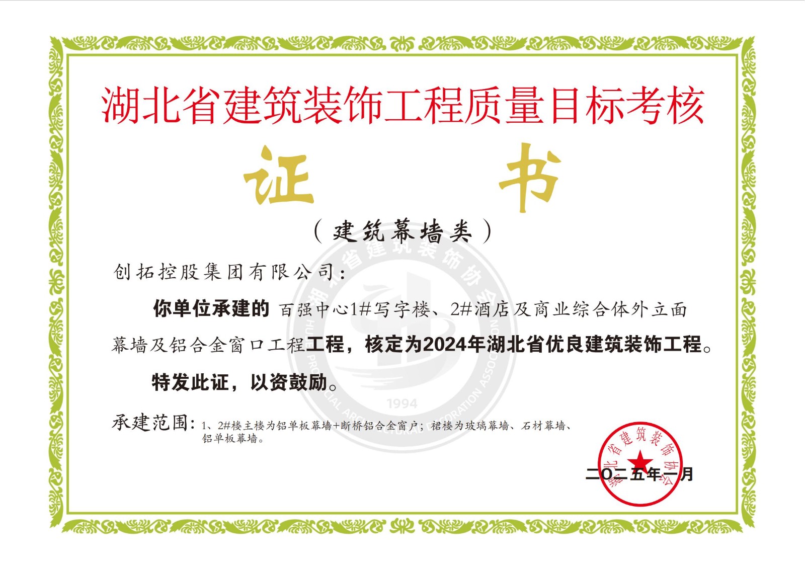 風(fēng)好帆正懸,奮斗正當(dāng)時(shí)。張俊奮力拼搏的精神深深鼓舞著全體員工,他細(xì)致入微和高標(biāo)準(zhǔn)嚴(yán)要求的作風(fēng)潛移默化中滋養(yǎng)了每一位員工的心靈,大家都把一絲不茍、吃苦耐勞的精神帶到了具體的工作中。公司多年來連續(xù)通過質(zhì)量、環(huán)境和職業(yè)健康三大綜合管理體系的認(rèn)證;通過不斷努力進(jìn)取和發(fā)展,擁有各種特種設(shè)備生產(chǎn)制造、安裝許可等專項(xiàng)資質(zhì);連續(xù)多年榮獲湖北省及十堰市重合同守信用企業(yè)、十堰市建筑裝飾先進(jìn)企業(yè),參建項(xiàng)目獲得多項(xiàng)省、市優(yōu)質(zhì)建筑裝飾工程及安全文明工地等榮譽(yù)。2024年張俊當(dāng)選為十堰市裝飾行業(yè)協(xié)會(huì)執(zhí)行會(huì)長(zhǎng)、湖北省建筑裝飾協(xié)會(huì)理事。